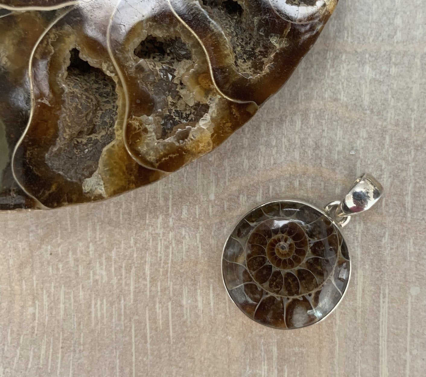 This Polished Ammonite and Sterling Silver pendant was hand picked for its high vibration, quality craftsmanship and resonating beauty.