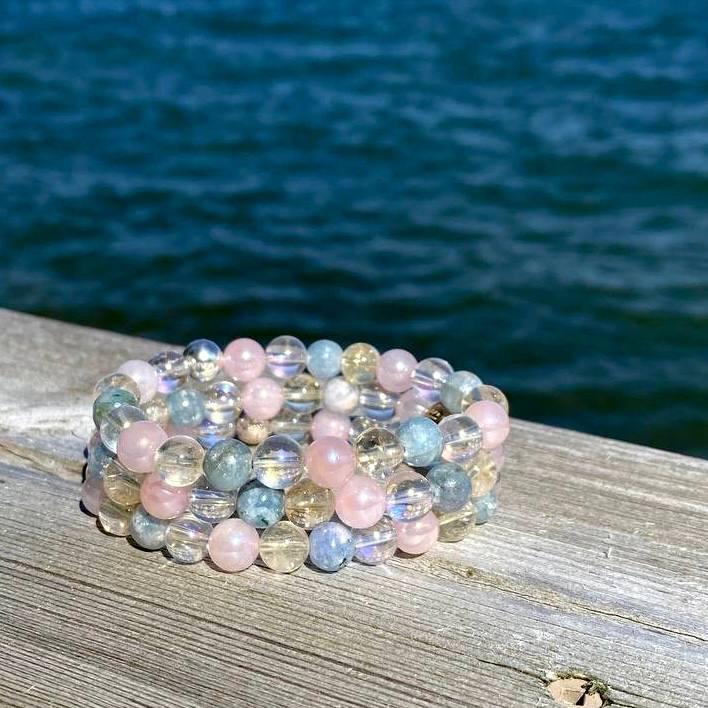 The Angel's Embrace bracelet is a celestial treasure crafted with angel aura quartz, angel aura rose quartz, and Celestine. Its ethereal beauty and gentle energies create a loving sanctuary, inviting divine guidance, unconditional love, and a deep sense of inner peace.
