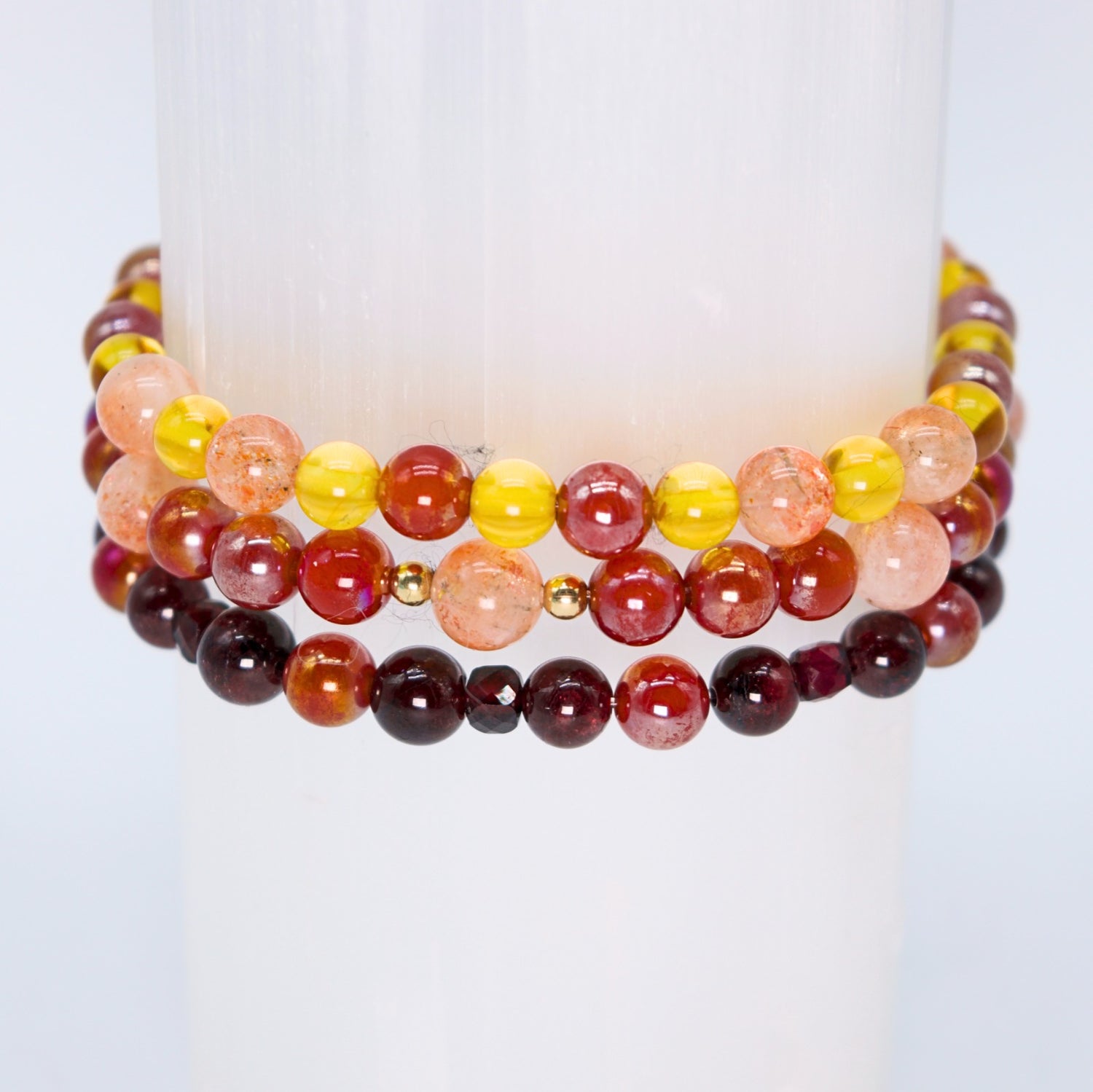 Garnet, Sunstone, Amber and Carnelian enhances protection & grounding through your Root Chakra while also stimulating creativity through the Sacral Chakra. Carnelian, Amber, and Sunstone also stimulate our will power through the Solar Plexus Chakra