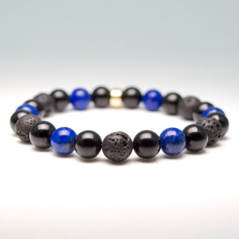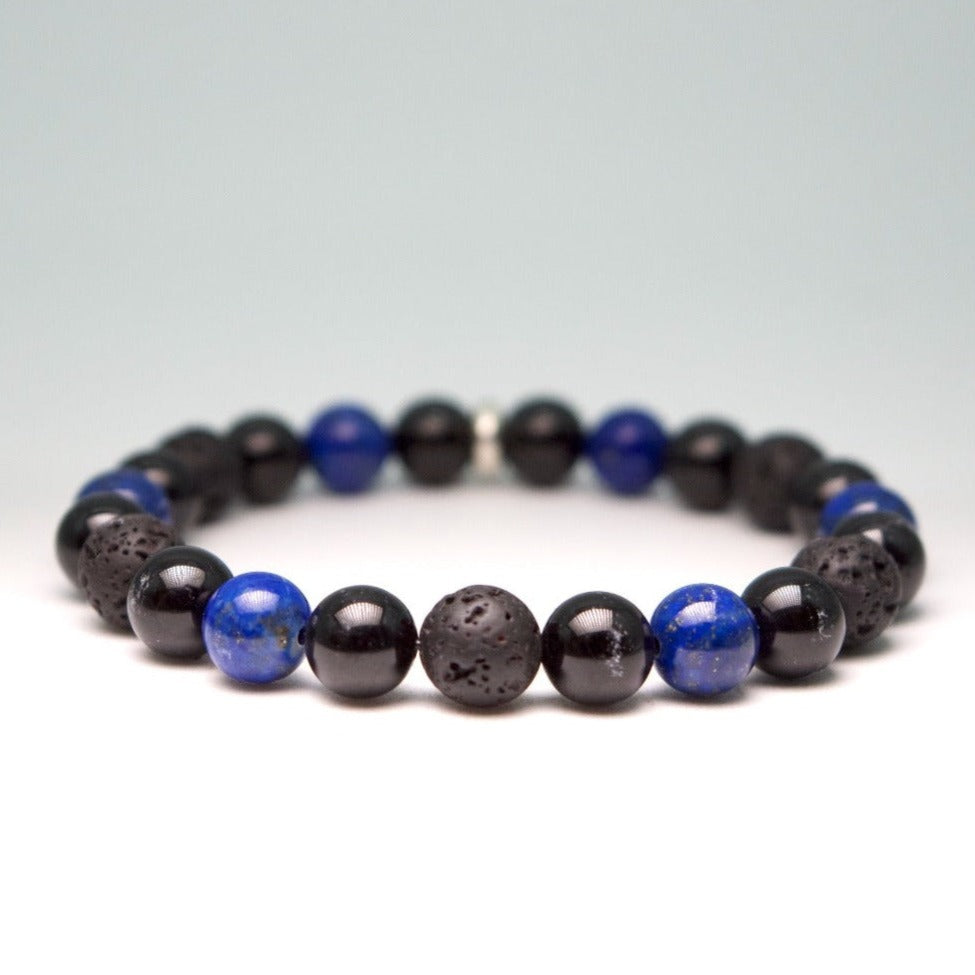 This intentionally hand-crafted bracelet is made with Lapis Lazuli, Lava Stone and Black Tourmaline.