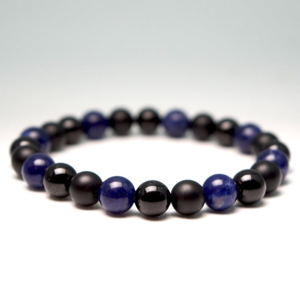 This intentionally hand-crafted bracelet is made with Sodalite, Black Onyx and Black Tourmaline.