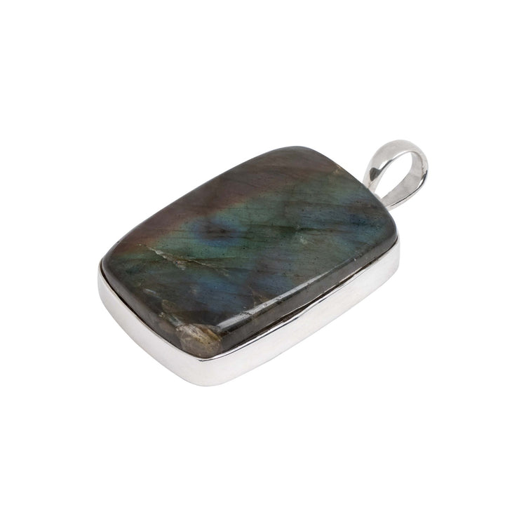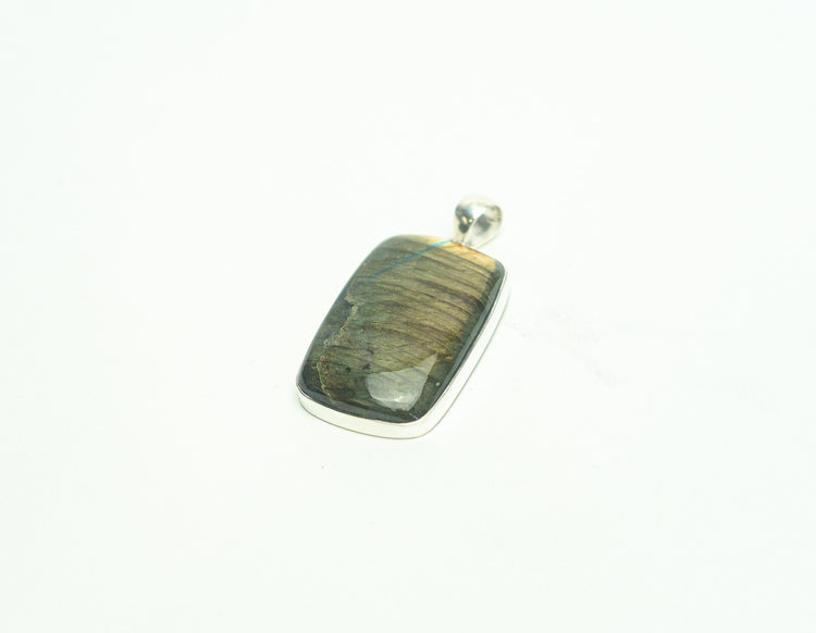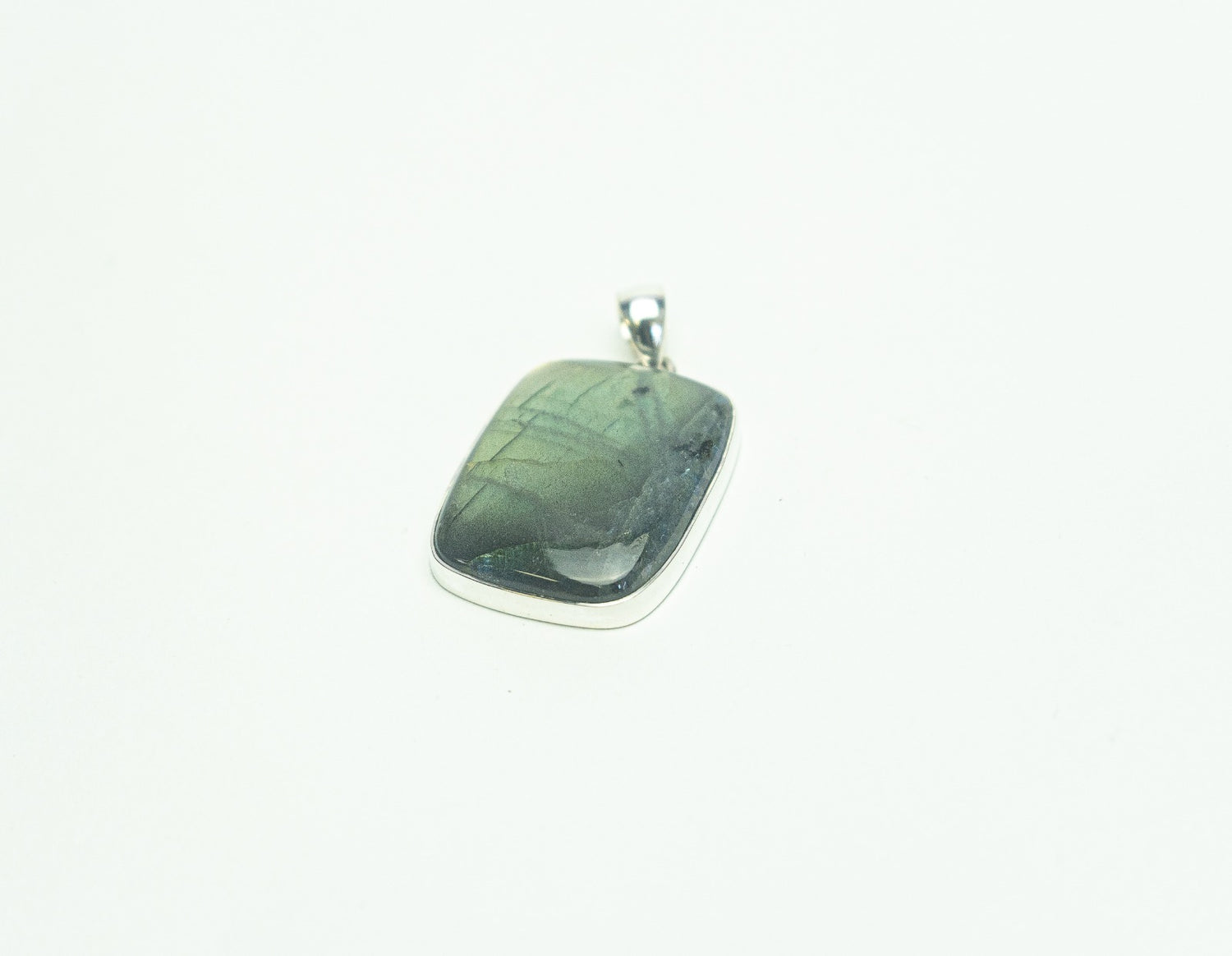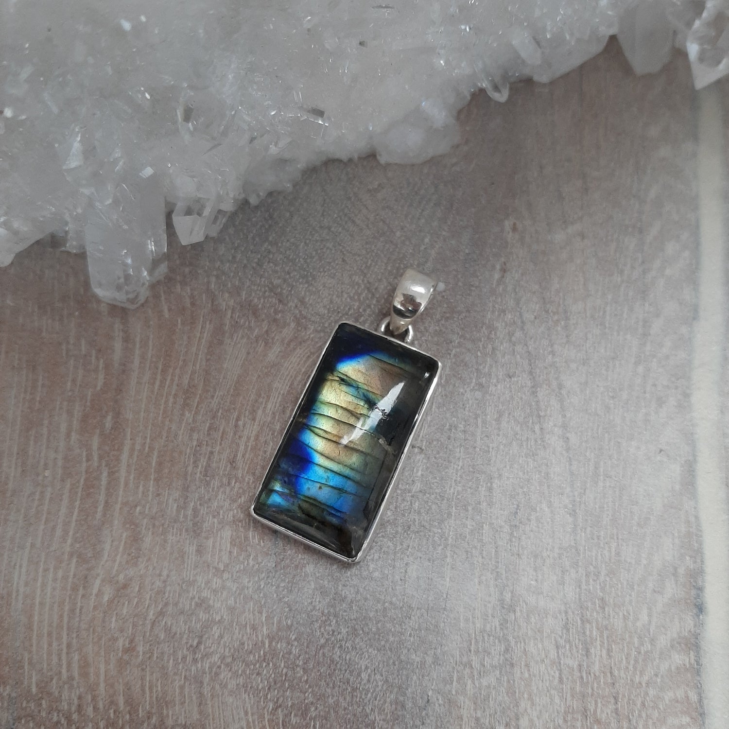 This Polished Labradorite and Sterling Silver Pendant was hand picked for its high vibration, quality craftsmanship and resonating beauty.