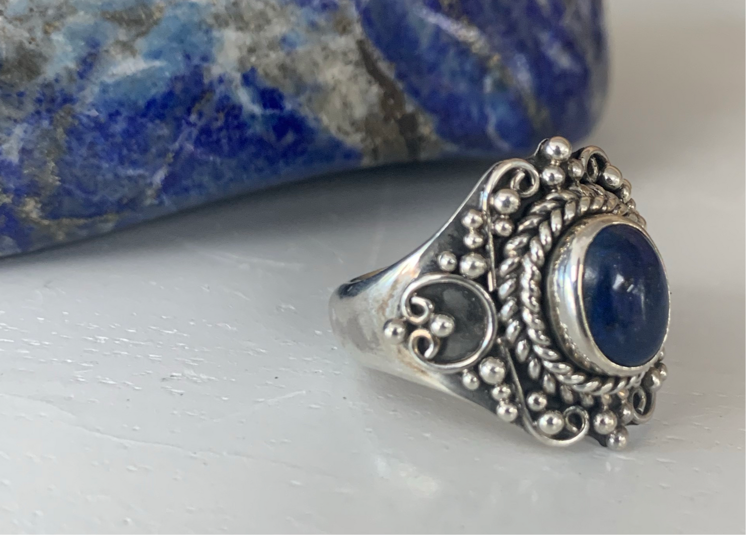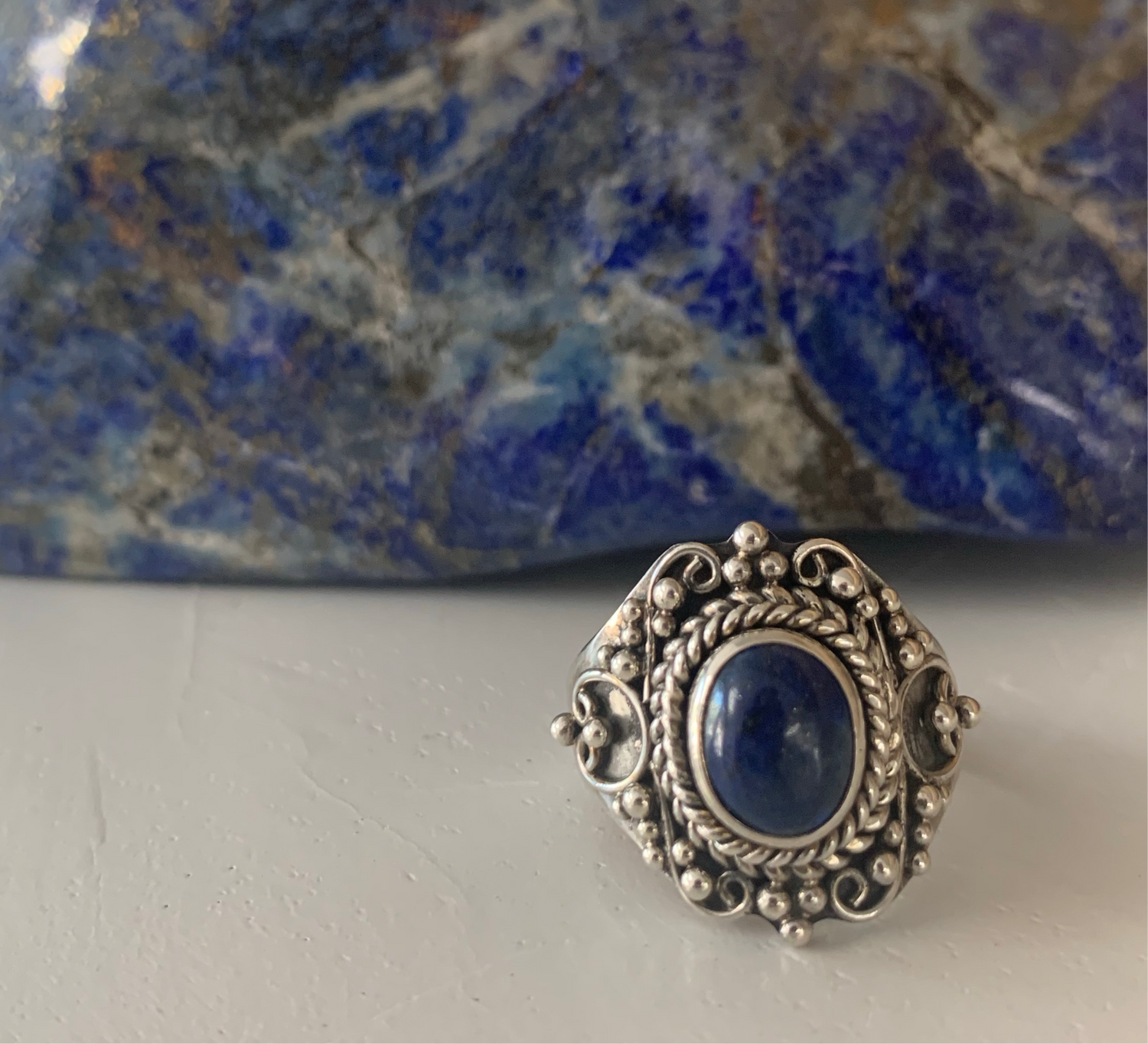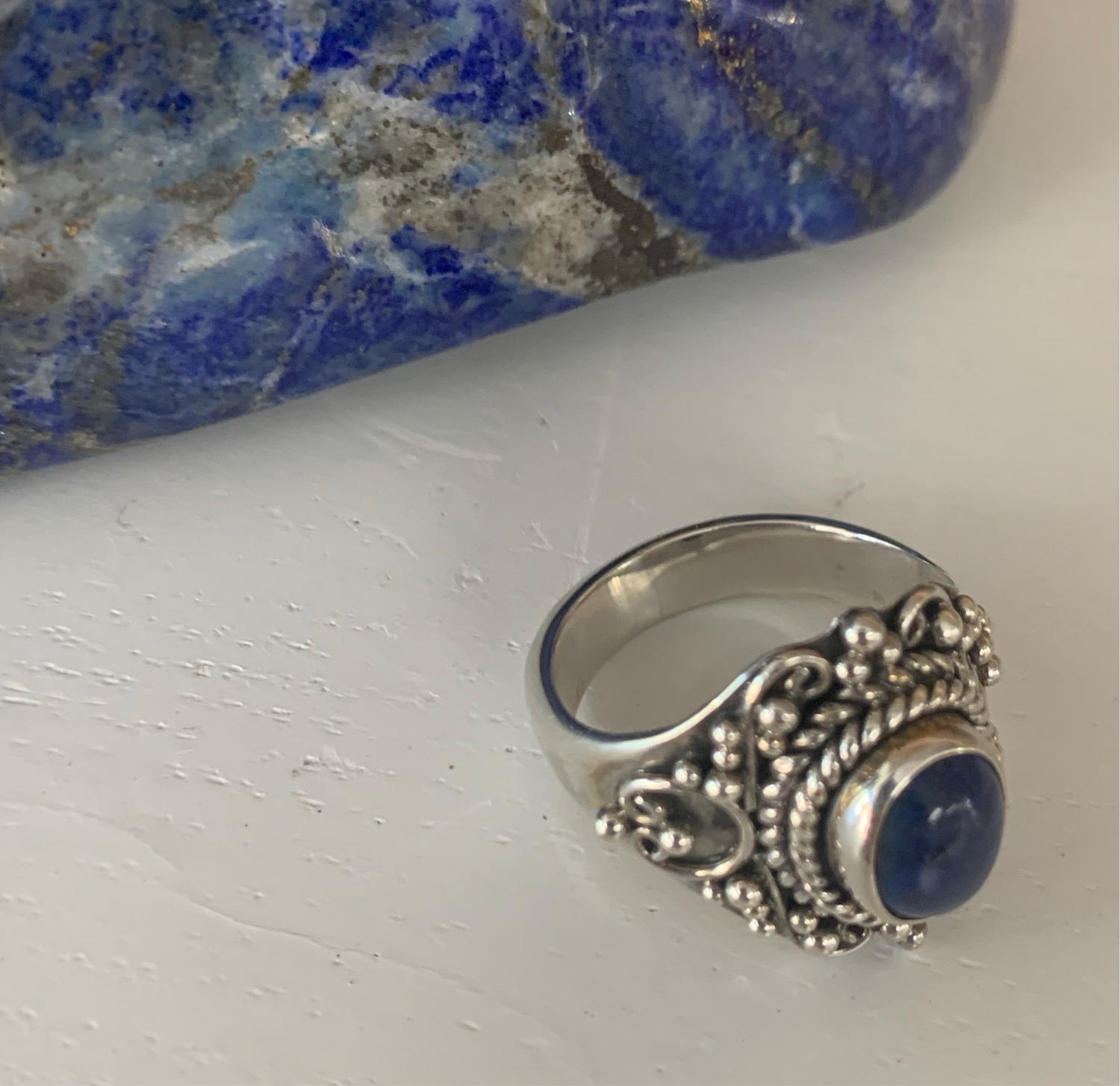 This Polished Lapiz Lazuli and Sterling Silver ring was hand picked for its high vibration, quality craftsmanship and resonating beauty.