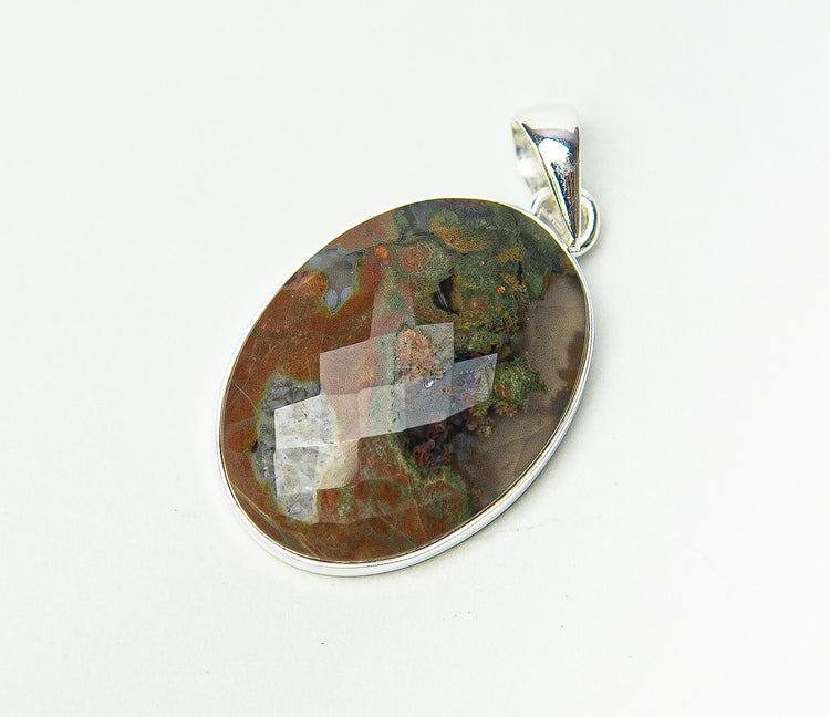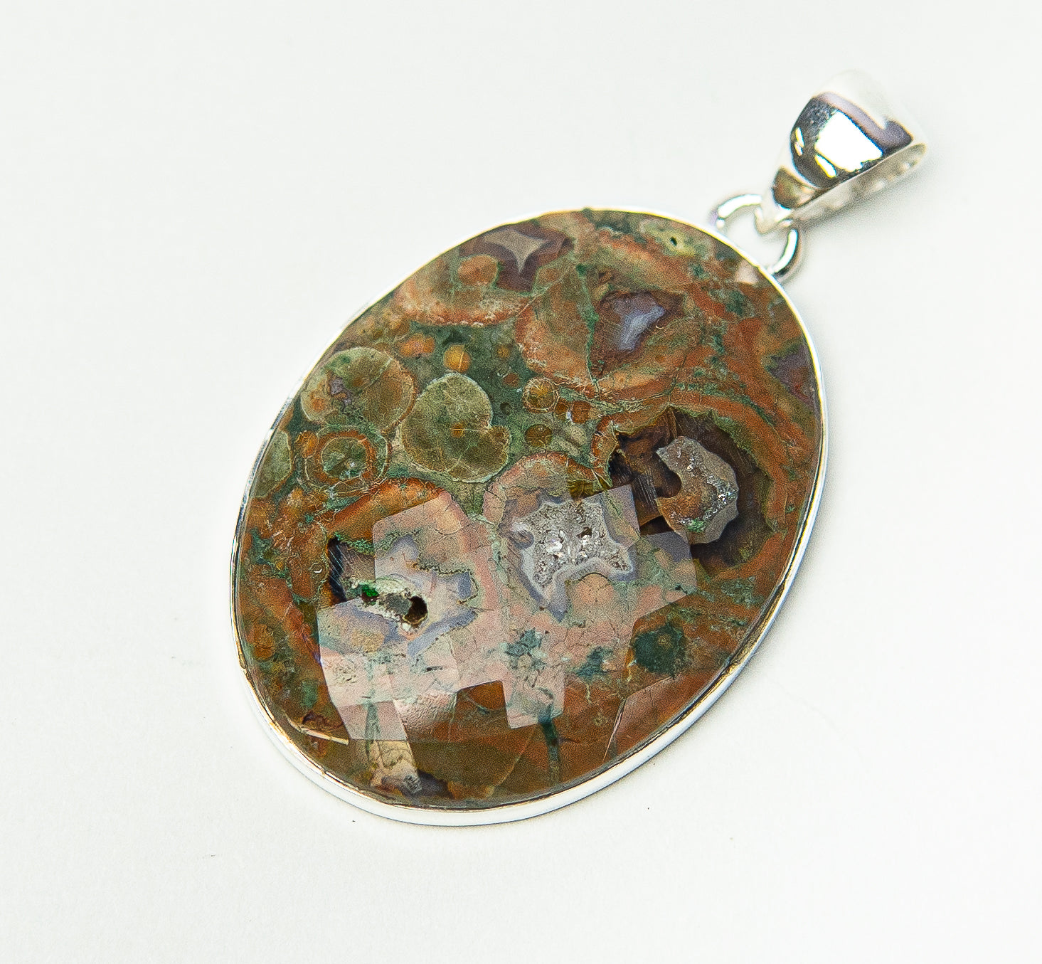 This Polished Rhyolite and Sterling Silver pendant was hand picked for its high vibration, quality craftsmanship and resonating beauty.
