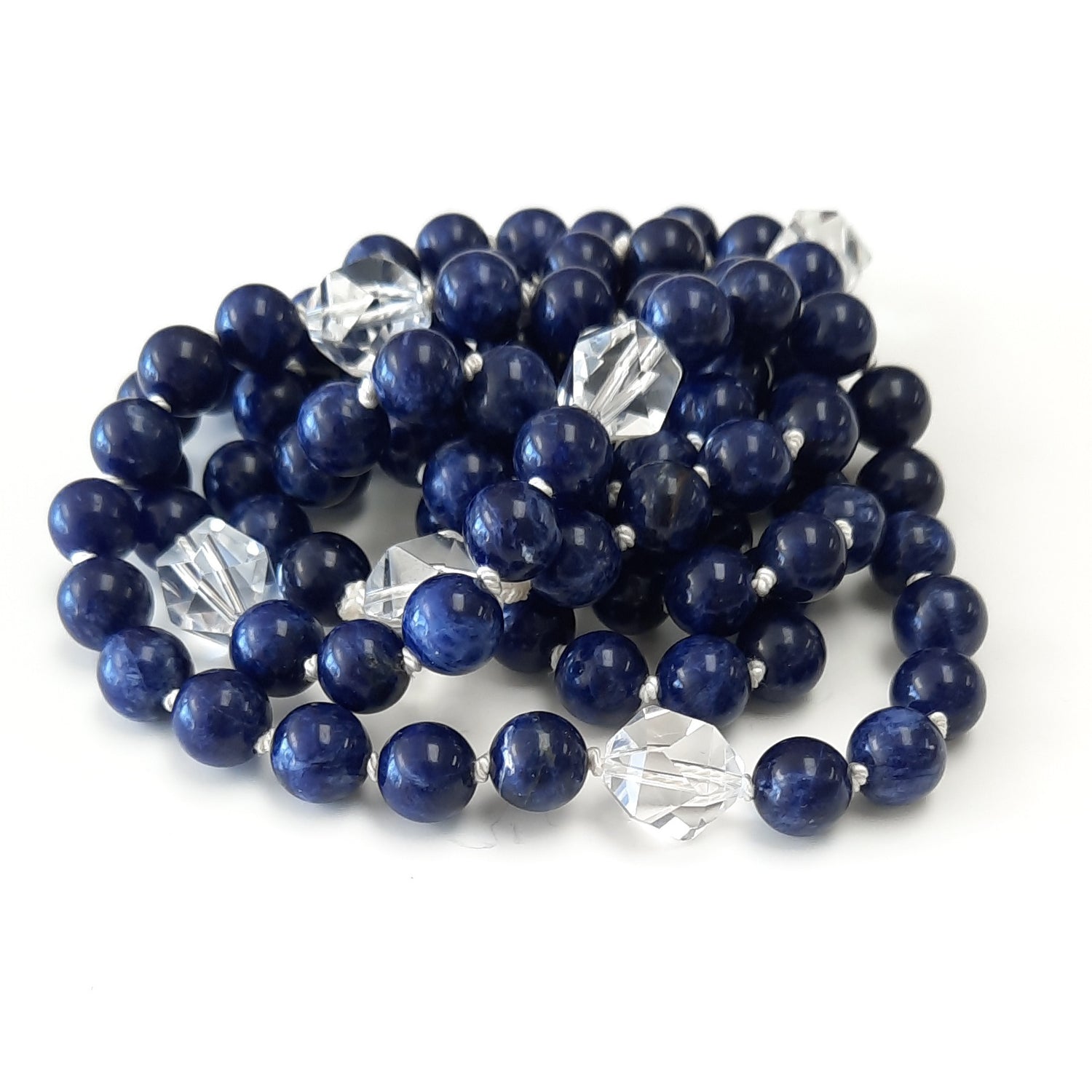 This handmade 108 bead mala is made with Sodalite and Clear Quartz.