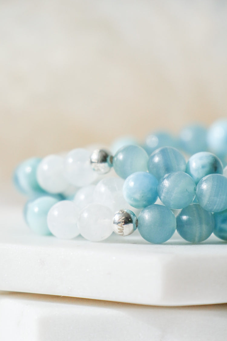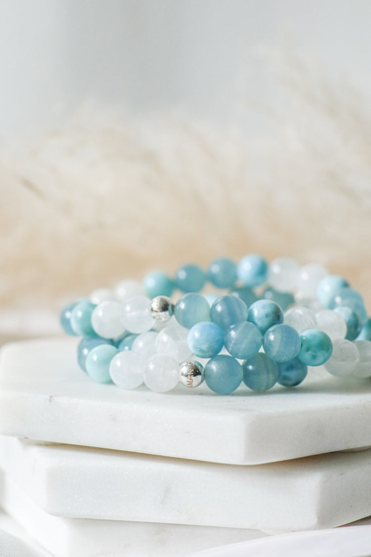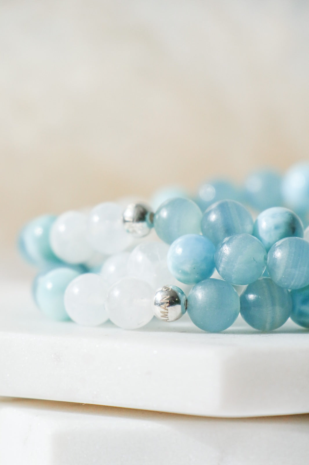 This intentionally hand-crafted bracelet is made with Blue Calcite, Moonstone, and Larimar. (includes one bracelet).